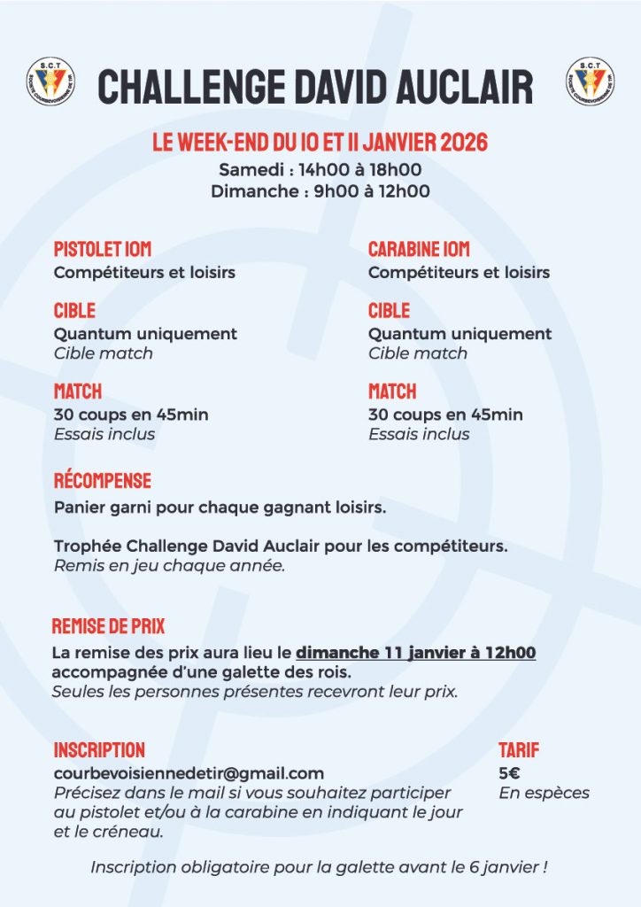 Le prochain challenge David Auclair se déroulera le week-end du 10 et 11 janvier 2026 à la SCT aux horaires d’ouverture du club.